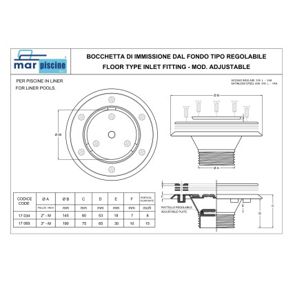 Форсунка донная Marpiscine 17034. Класс Premium. Оснащена крышкой на винтах из нержавеющей стали. Закладные Marpiscine отличаются эстетическим видом и повышенной надежностью, срок службы таких деталей достигает десятков лет.
