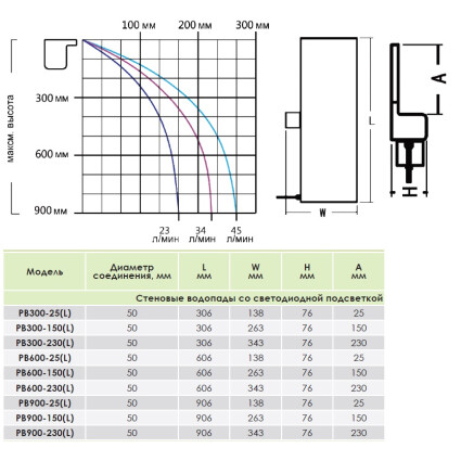 Стеновой водопад со светодиодной подсветкой Aquaviva PB 900-150(L). Выполняет циркулирующую и декорирующую функцию. Изготовлен из ABS пластика. Спокойное падение воды. Настройка цвета при помощи панели или пульта.